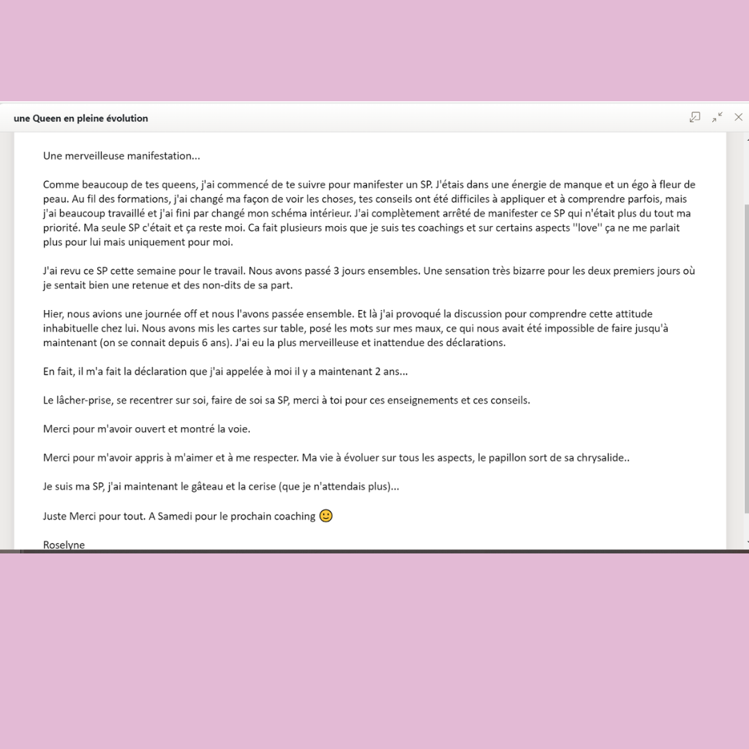 j'ai accompagné des centaines de femmes à manifester l'amour & leur personne spécifique et c'est possible pour vous aussi grâce à mon approche unique.